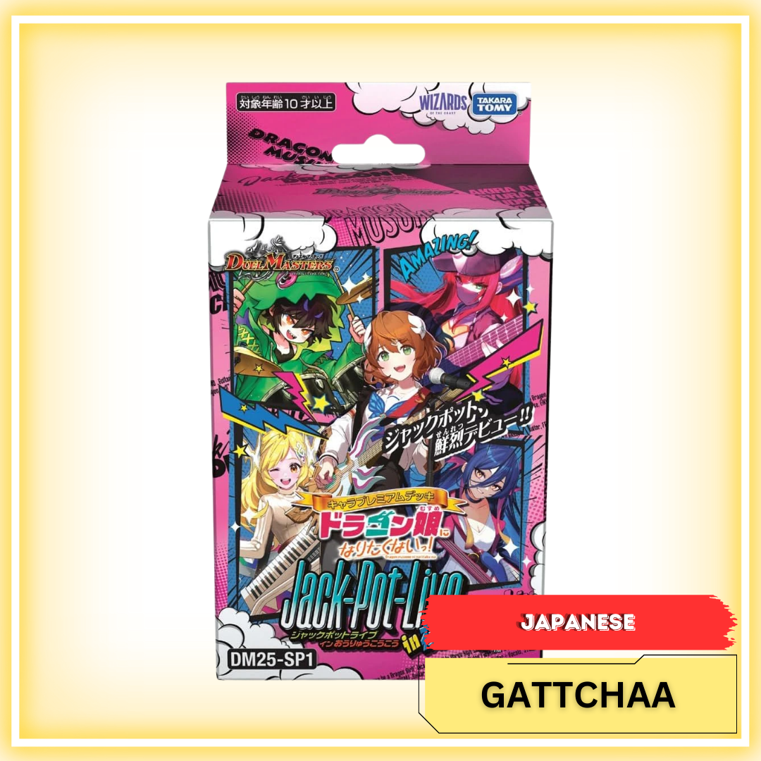 The Duel Masters TCG Character Premium Deck “I Don’t Want to Be a Dragon Girl!” Jack-Pot-Live!! in Sakura Dragon High School is a pre-constructed deck designed for both new and seasoned players. This deck spotlights popular characters and strategies, offering a unique gaming experience. It comprises 40 cards, including powerful new additions and popular reprints, all featuring exclusive character illustrations. Some reprinted cards come with alternate artwork, enhancing their appeal. Additionally, one of the new cards is randomly selected to feature a special illustration. A paper deck case is included for convenient storage.